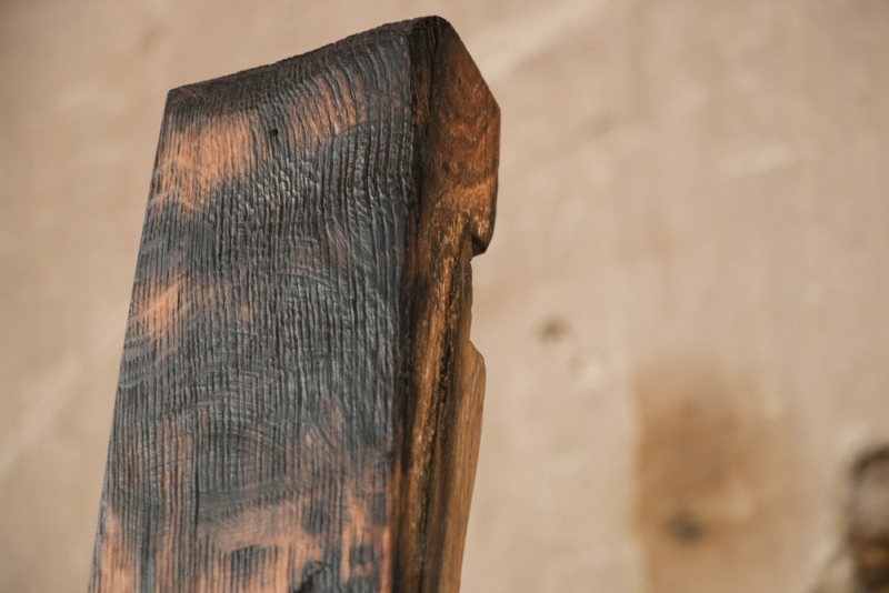 Daube eines ca. 50 Jahre alten Weißweinfasses. Standplatte aus Schwarzeisen, sämtliche Oberflächen sind geölt.