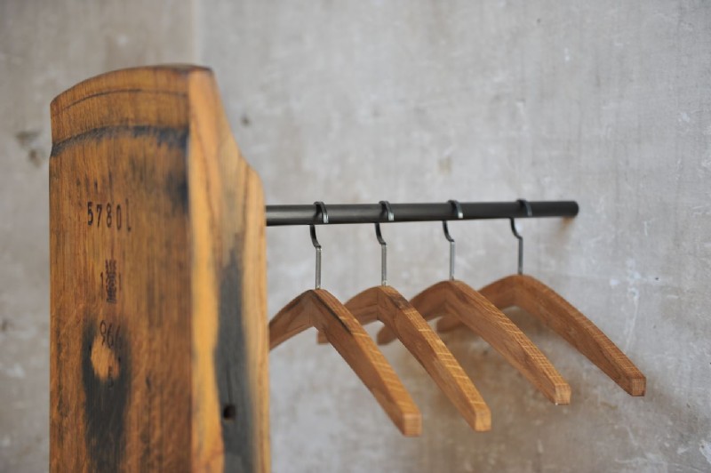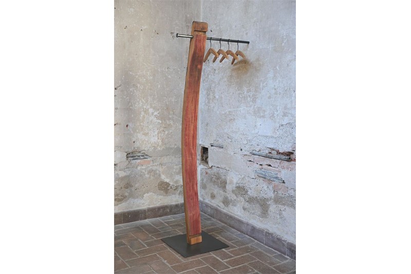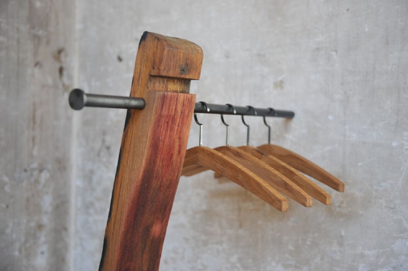 Daube eines ca. 50 Jahre alten Rotweinfasses. Standplatte aus Schwarzeisen, Kleiderbügel aus den Dauben eines Weißweinfasses. Sämtliche Oberflächen sind geölt.