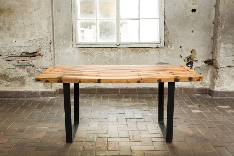 Aus den Dauben von Akazienfässern (Jahrgang 1974). Untergestell aus Rohstahl, sämtliche Oberfläche sind geölt.