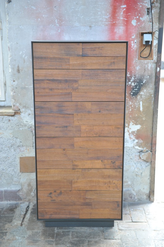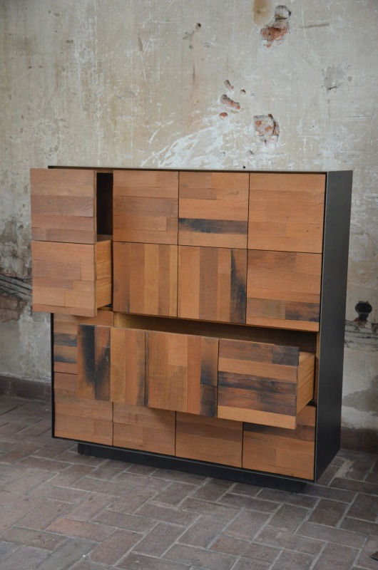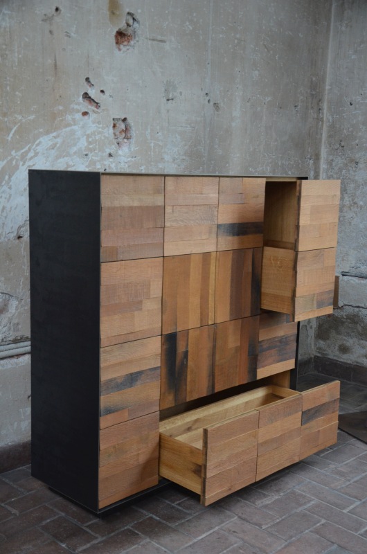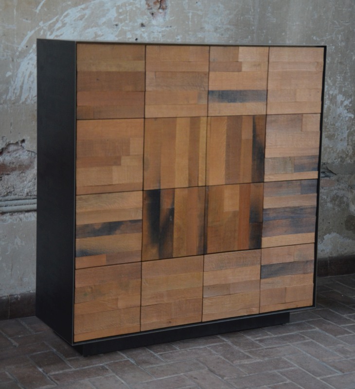 Schrank mit 4 Türen, Push-Pull-Öffnung. Die Türen sind aus den Deckeln eines Weißweinfasses aus dem Jahre 1954. Korpus ist aus den Dauben von 60 bis 110 Jahre alten Weinfässern. Füße sind aus Baustahl, sämtliche Oberflächen sind geölt.