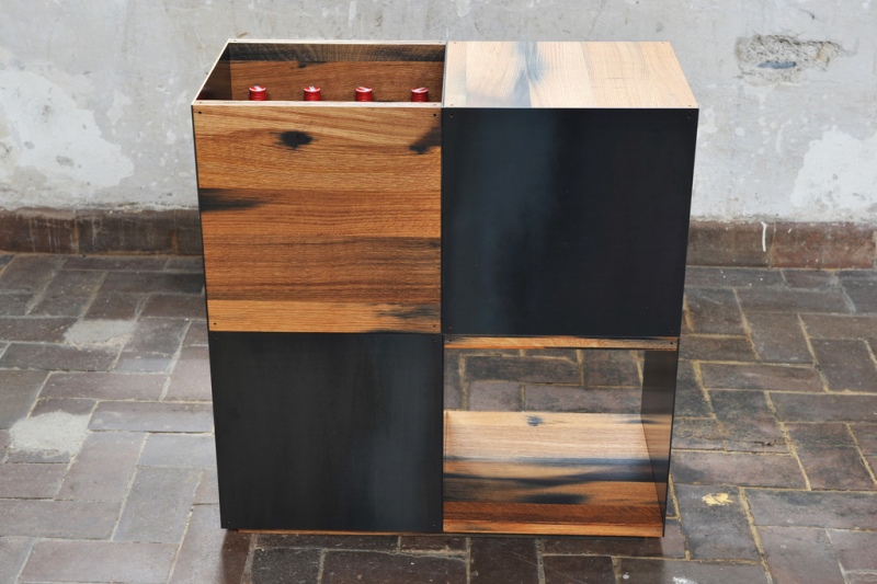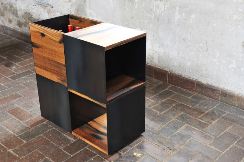 4 Kuben bestehen aus den Deckeln von Weißweinfässern aus dem Jahre 1958, in Verbindung mit Schwarzeisen. Kuben können von allen Seiten miteinander gesteckt werden, sämtliche Oberflächen sind geölt.