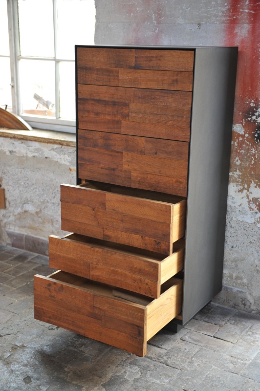 Kommode mit 8 Schubladen, Push-Pull-Öffnung. Die Fronten der Schubladen sind aus den Dauben eines Weißweinfasses aus dem Jahre 1950. Korpus ist aus Eternit. Sämtliche Oberflächen sind geölt.