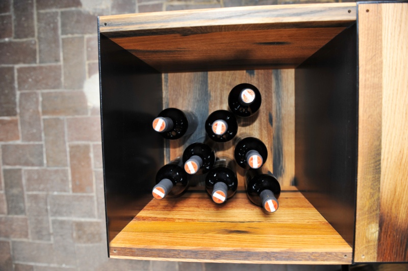 Regal besteht aus 7 Einzelteilen. Seitlich 4 Kuben offen, mittig Element für Weinflaschenlagerung je 9 Flaschen von jeder Seite und 2 Ladenelementen. Objekt besteht aus den Deckeln von Weißweinfässern aus dem Jahre 1958, in Verbindung mit Schwarzeisen. Sämtliche Oberflächen sind geölt.