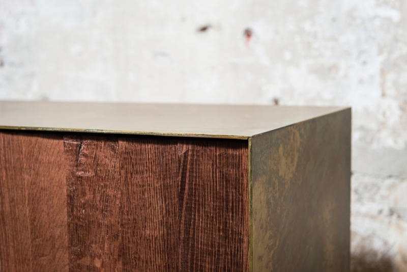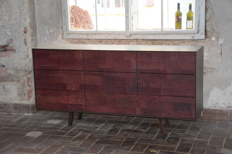 Kommode mit 5 Schubladen Push-Pull-Öffnung. Die Fronten der Schubladen sind aus den Dauben eines ca. 70 Jahre alten Rotweinfasses, sämtliche Oberflächen sind geölt, nur Vorderseite ist unbehandelt. Korpus ist aus Messing matt lackiert.