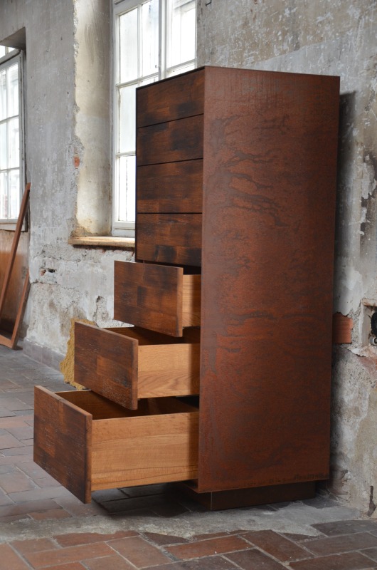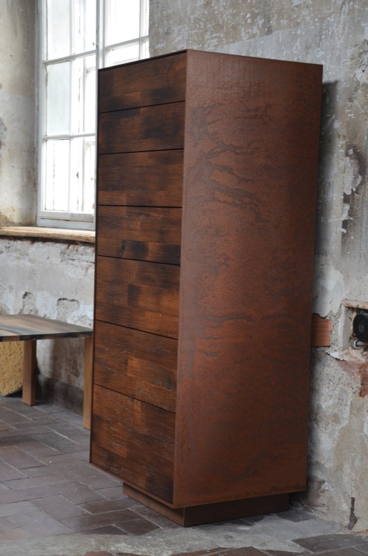 Kommode mit 7 Schubladen, Push-Pull-Öffnung. Die Fronten der Schubladen sind aus den Dauben eines Rotweinfasses aus dem Jahre 1947. Korpus ist aus rostigem Alteisen. Sämtliche Oberflächen sind geölt.