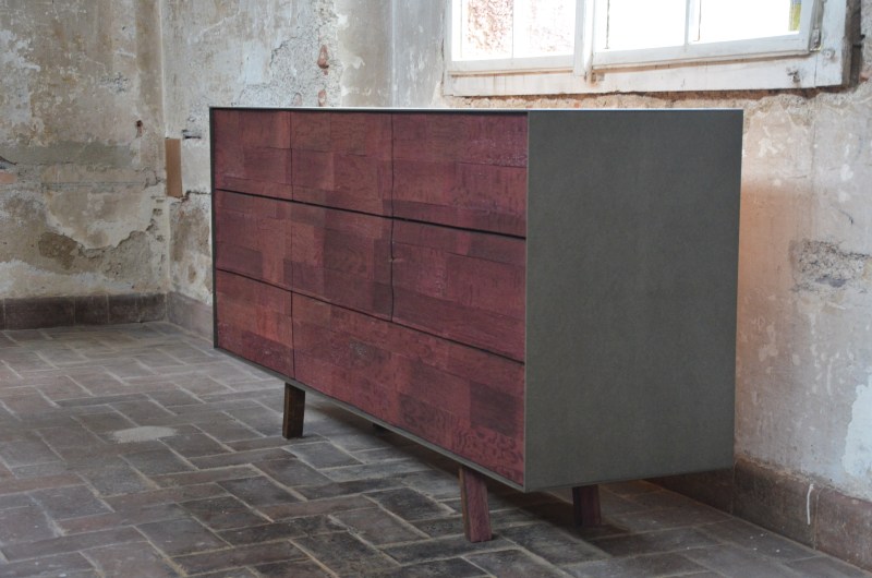Kommode mit 6 Schubladen, Push-Pull-Öffnung. Die Fronten sind aus den Dauben eines Weißweinfasses aus dem Jahre 1954. Korpus ist aus Eternit. Sämtliche Oberflächen sind geölt.